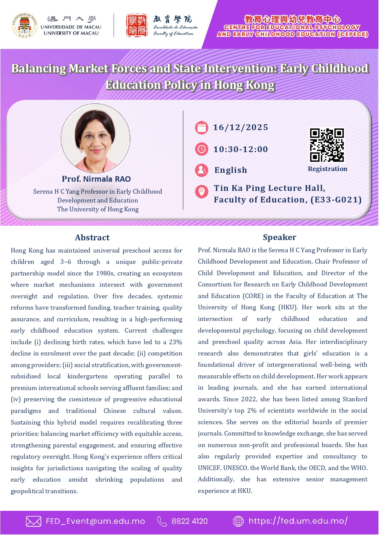FED-CEPECE Seminar: “Balancing Market Forces and State Intervention: Early Childhood Education Policy in Hong Kong” Gallery FED-CEPECE Seminar: “Balancing Market Forces and State Intervention: Early Childhood Education Policy in Hong Kong” Events, Seminar FED-CEPECE Seminar: “Balancing Market Forces and State Intervention: Early Childhood Education Policy in Hong Kong” Dec 05 | Fri ...