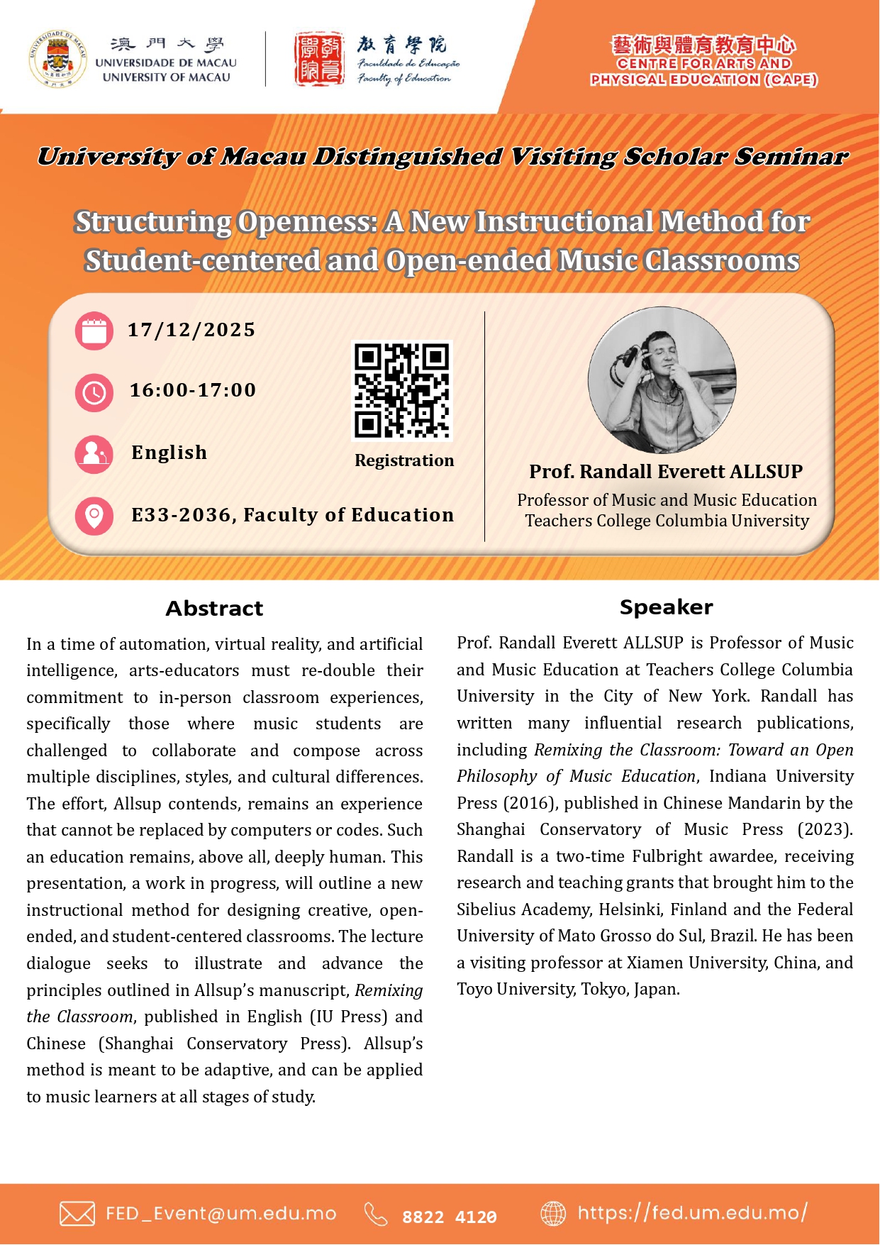 FED-CAPE University of Macau Distinguished Visiting Scholar Seminar: “Structuring Openness: A New Instructional Method for Student-centered and Open-ended Music Classrooms” Gallery FED-CAPE University of Macau Distinguished Visiting Scholar Seminar: “Structuring Openness: A New Instructional Method for Student-centered and Open-ended Music Classrooms” Events, Seminar FED-CAPE University of Macau Distinguished Visiting Scholar Seminar: “Structuring Openness: A New Instructional Method for Student-centered and Open-ended Music Classrooms” Dec 05 | Fri ...