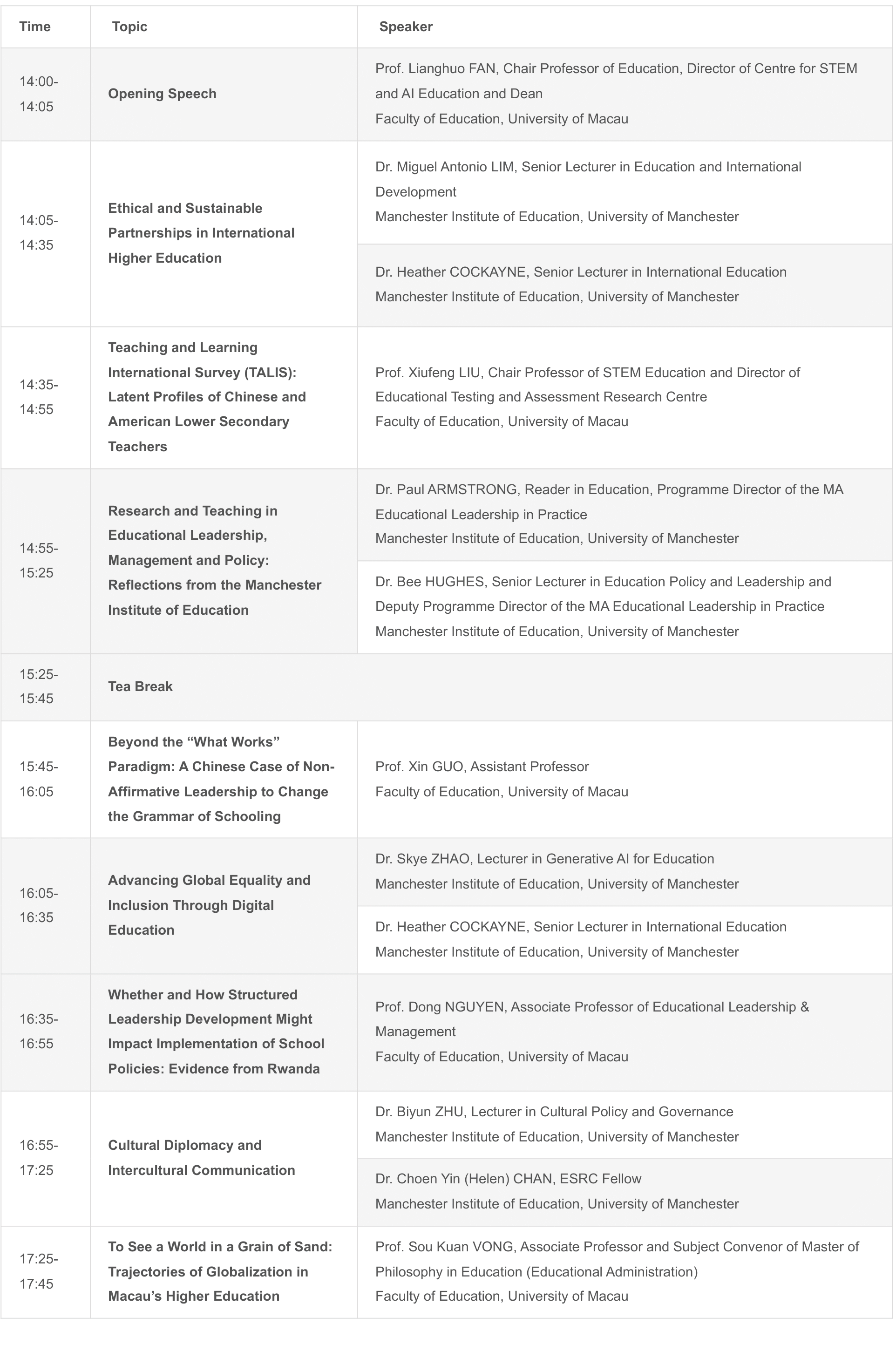 | 14:55-15:25 | Research and Teaching in Educational Leadership, Management and Policy: Reflections from the Manchester Institute of Education | Dr. Paul ARMSTRONG, Reader in Education, Programme Director of the MA Educational Leadership in Practice Manchester Institute of Education, University of Manchester |