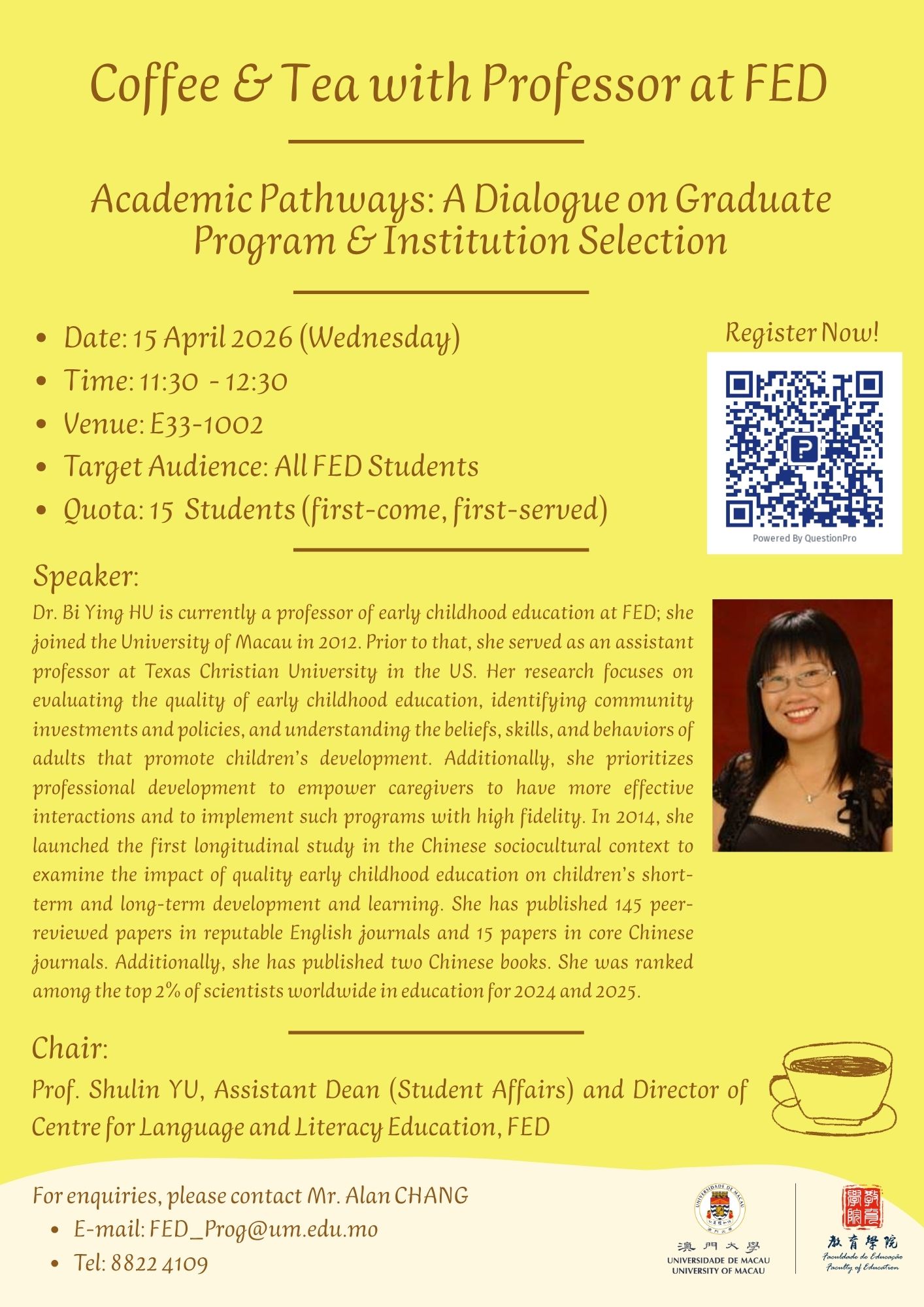 “2026/2027 學年校長推薦入學計劃” 澳門大學教育學院準新生午餐聚會 Gallery “2026/2027 學年校長推薦入學計劃” 澳門大學教育學院準新生午餐聚會 最新消息 “2026/2027 學年校長推薦入學計劃” 澳門大學教育學院準新生午餐聚會