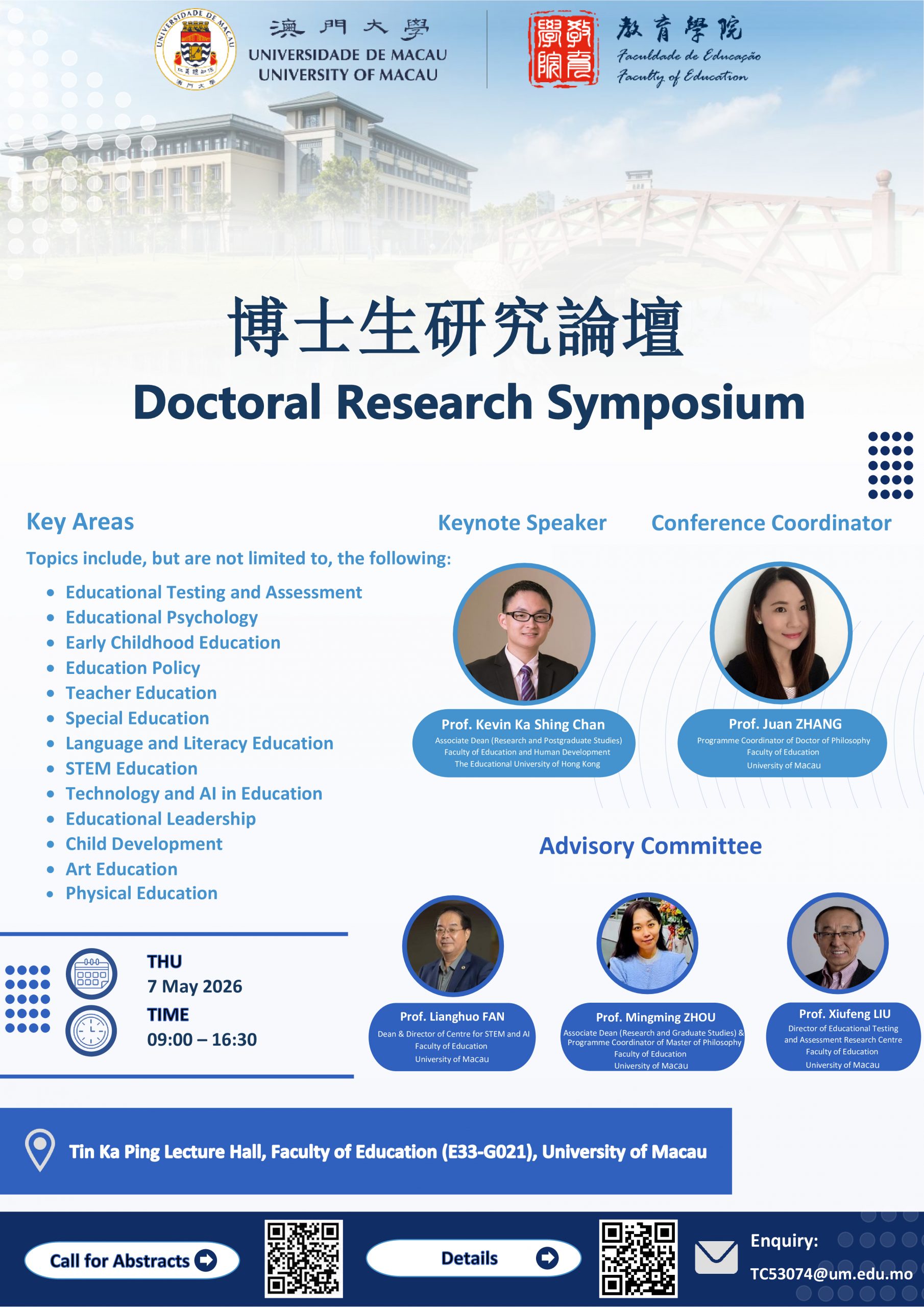 The Faculty of Education (FED) at the University of Macau (UM) is pleased to announce the Doctoral Research Symposium. The symposium will be held on 7 May 2026 (Thursday) at FED, UM in Macau. We are now calling for submissions of doctoral research abstracts. The submission period will be open from 16 March to 15 April 2026.